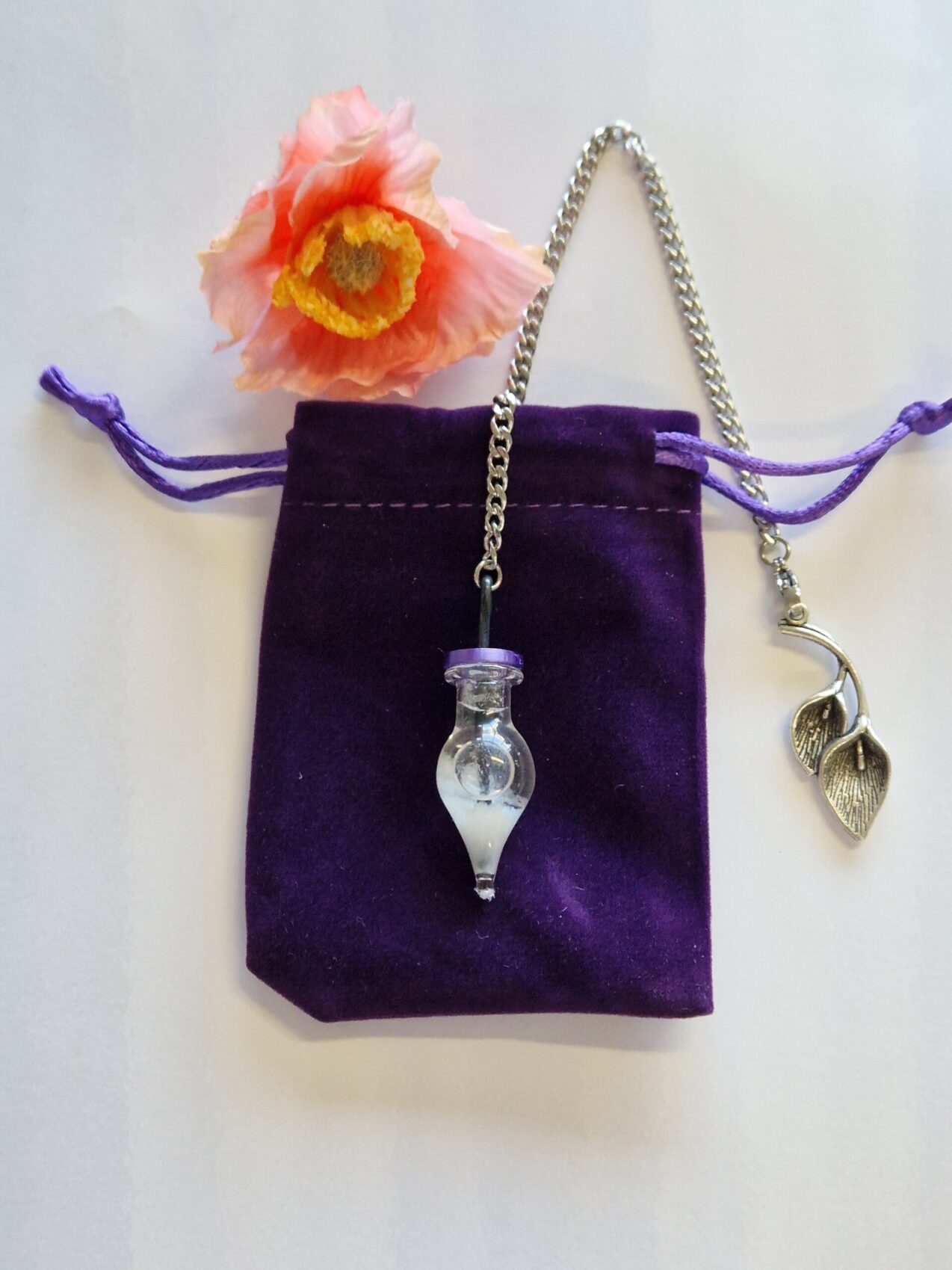 Er is een pendel met een zwart kettinkje met paarse flower of life geprint of een zilverkleurig kettinkje met zilverkleurig bloembedeltje